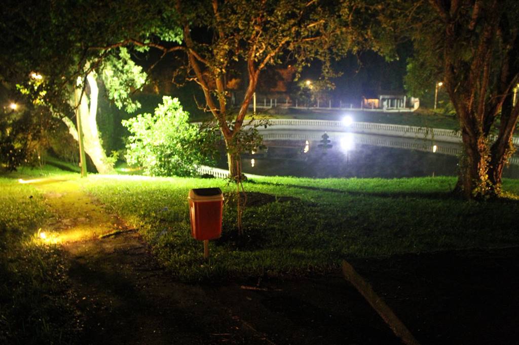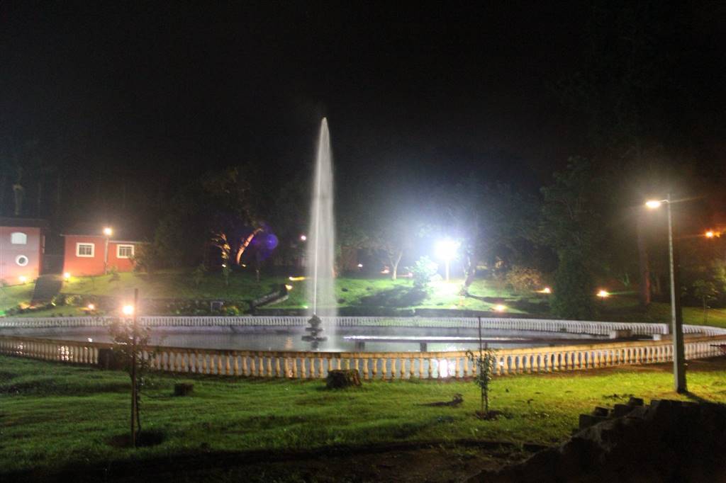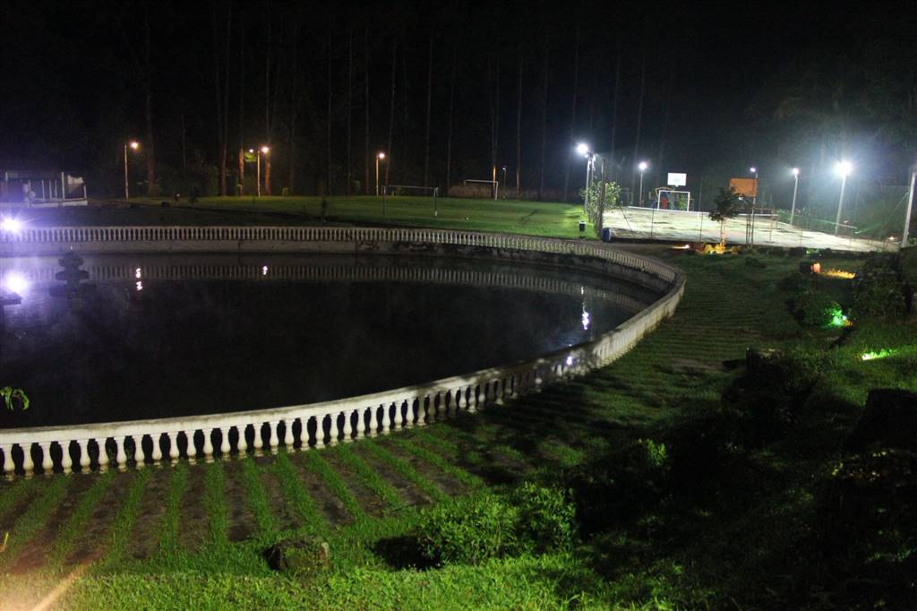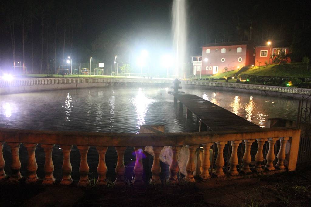 Lago com chafariz, campo de futebol,